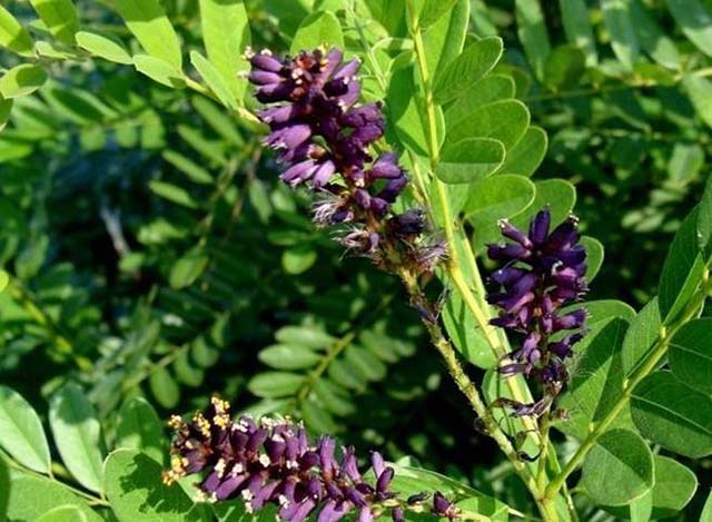 紫穗槐豆科落葉灌木,高1-4米。枝褐色、被柔毛,后變無毛,葉互生,基部有線形托葉,穗狀花序密被短柔毛,花有短梗;花萼被疏毛或幾無毛;旗瓣心形,紫色。莢果下垂,微彎曲,頂端具小尖,棕褐色,表面有凸起的疣狀腺點。